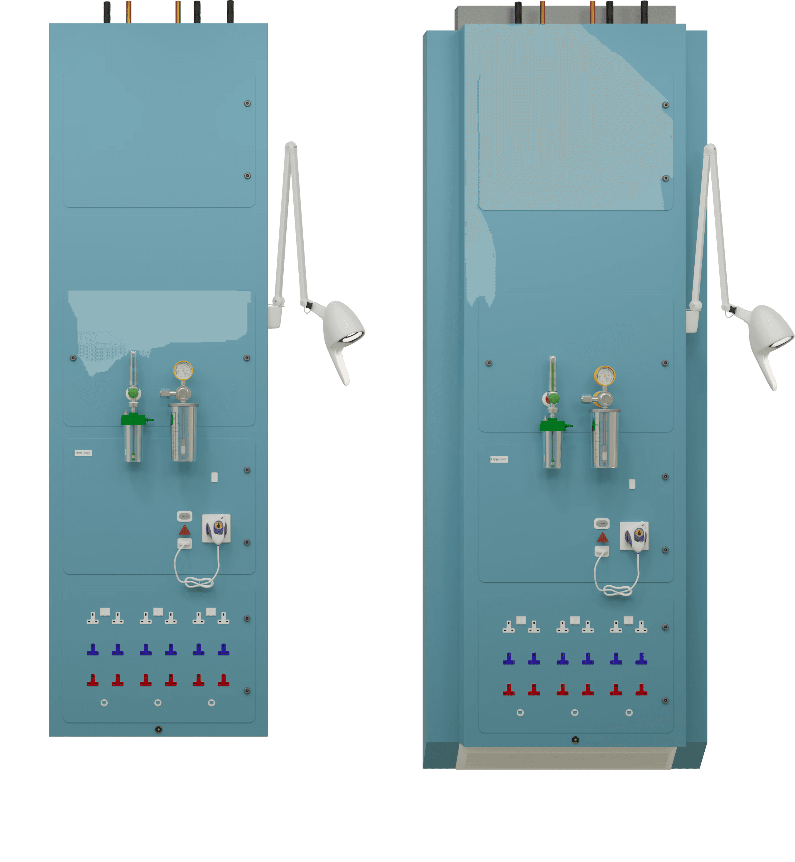 Hygipod MSU is built from Hygiboard, a robust material that safely encapsulates bedside services and supports accessories such as rails, lights, and screens. Internal ducts separate power, data, and service lines, with hinged access doors secured by anti-pick locks and removable gas port panels for easy maintenance